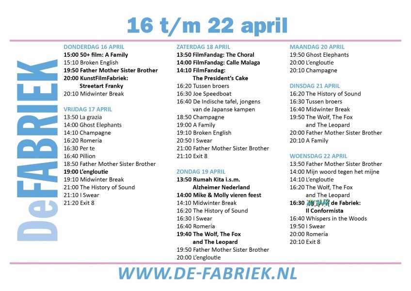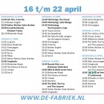 Via de agenda op onze homepage is makkelijk na te gaan wat er per dag bij ons draait. Om het nog gemakkelijker te maken hebben we ook een weekladder die in ons gebouw is te vinden. Daarop is in één oogopslag te zien wat op welke dag draait. Klik op de afbeelding hieronder om deze ladder groter in beeld te zien.